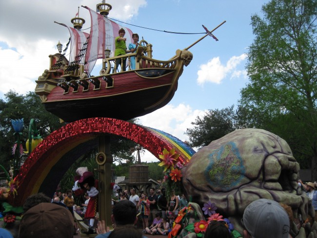 - Peter Pan and Captain Hook ride a float with a huge sequins rainbow on it. Not that there’s anything wrong with that.